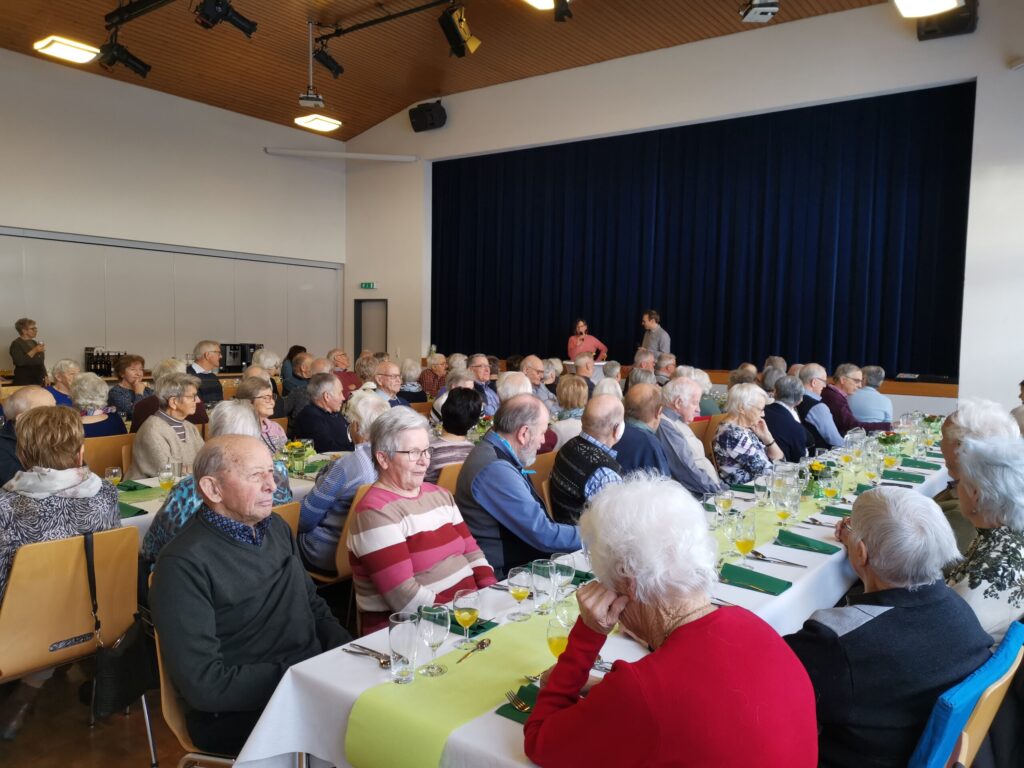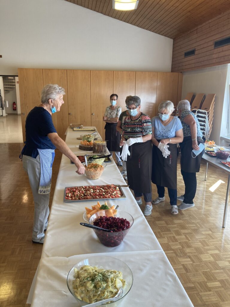 Krea­ti­ve Frau­en ver­wöh­nen die Gäste am Senio­ren­mit­tags­tisch der Pfar­rei. Es ist ein belieb­tes Ange­bot, bei dem sich Senio­ren für Senio­rin­nen enga­gie­ren. In der Küche wird fleis­sig gerü­stet, gekocht und alles für ein fei­nes sai­so­na­les Essen vor­be­rei­tet. Die Tische im Pfar­rei­heim wer­den eben­falls der Jah­res­zeit ent­spre­chend ein­la­dend geschmückt. Hand in Hand, mit viel Herz­blut, wird ein gemein­sa­mes Ziel mit Hin­ga­be und Stolz ver­wirk­licht. Das Senio­ren­wir­te­team der Pfar­rei darf von den Mit­tags­tisch­gä­sten immer viel Lob und Dank entgegennehmen.