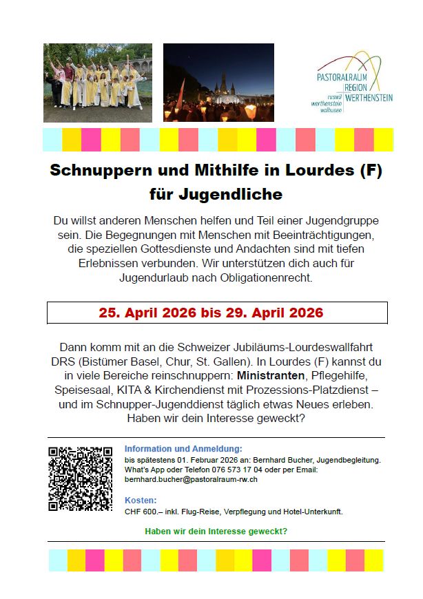 Dann komm mit an die Schwei­zer Jubi­lä­ums-Lour­des­wall­fahrt DRS (Bis­tü­mer Basel, Chur, St. Gal­len). In Lour­des (F) kannst du in vie­le Berei­che rein­schnup­pern: Mini­stran­ten, Pfle­ge­hil­fe, Spei­se­saal, KITA & Kir­chen­dienst mit Pro­zes­si­ons-Platz­dienst – und im Schnup­per-Jugend­dienst täg­lich etwas Neu­es erle­ben. Haben wir dein Inter­es­se geweckt?